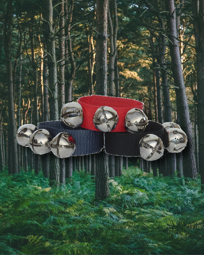 Comes with three 1″ gold bells, nylon webbing in navy red and black colours with velcro closure.